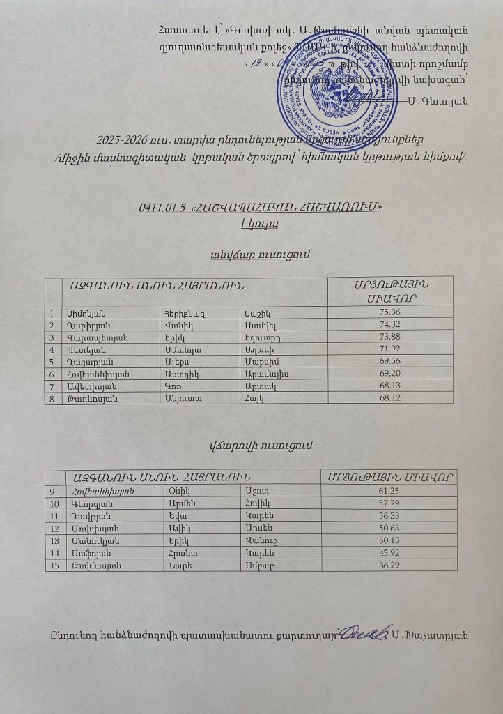 20.08.202501.10.2025 Hayk Asatryan Շնորհավորում ենք Քոլեջ ընդունված դիմորդներին Ներկայացնում ենք 2025-2026 ուսումնական տարվա ընդունելության 1-ին փուլի արդյունքները.